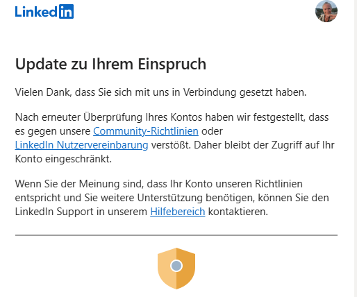 Jetzt wurde ich auch bei LinkedIn gesperrt. Ich kann mich dort nicht mehr anmelden. Seit mehreren Tagen erhalte ich die Meldung, dass mein Konto „temporär gesperrt“ sei, bis ich mich identifiziere.