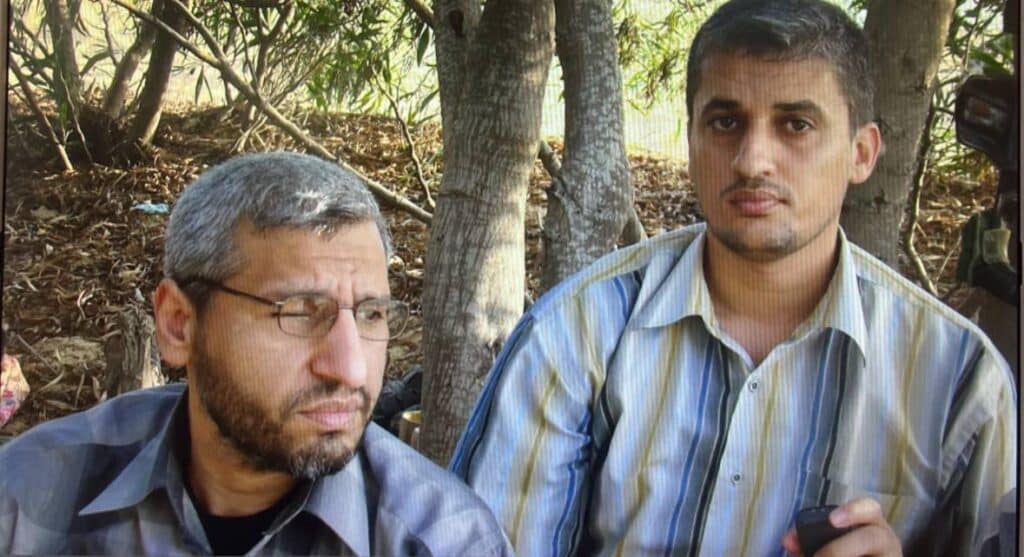 Israel hatte Geheimdienstinformationen erhalten, wonach Mohammed Deif (links, mit Brille) seine Tunnels für ein militärisches Treffen mit diversen Kommandanten der Hamas überirdisch, in einem von der Hamas gegenüber Zivilpersonen hermetisch abgeriegelten Grundstück treffen werde.