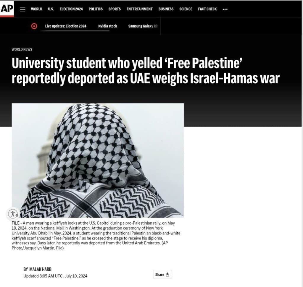 Associated Press: Ein Student der New York University in Abu Dhabi wurde einen Tag, nachdem er bei seiner Abschlussfeier mit einer palästinensischen Mütze „Freies Palästina“ gerufen hatte, aus den Vereinigten Arabischen Emiraten geworfen.