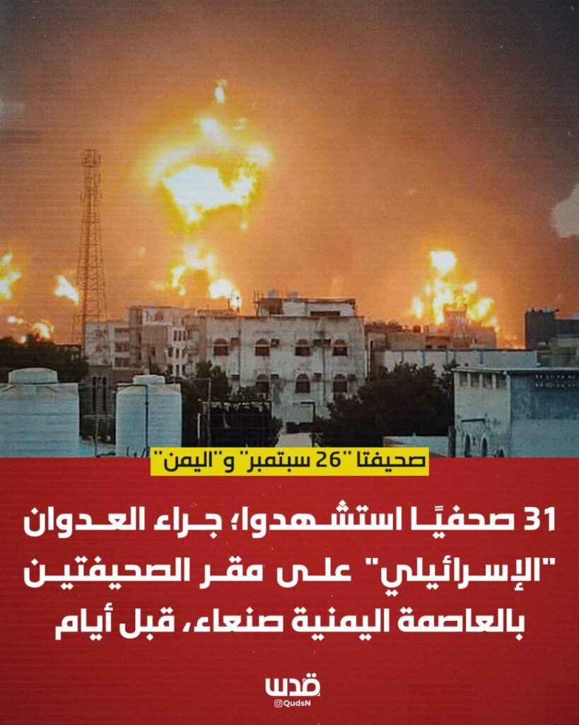 Sanaa lässt verlauten: „31 Journalisten wurden beim jüngsten israelischen Angriff in Sanaa getötet, darunter auch die Zeitungsredaktionen Al-Iman und 26. September„.