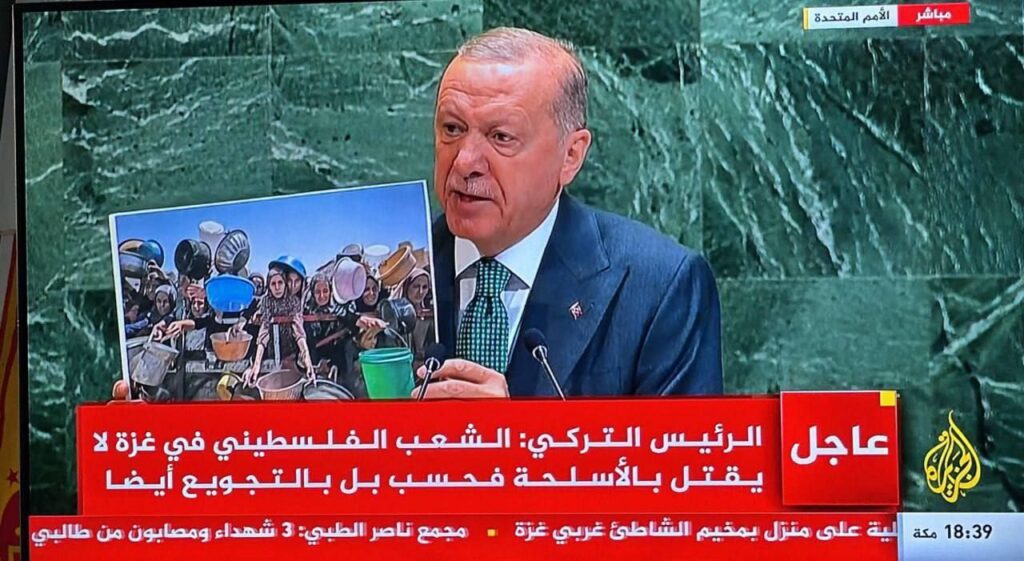 Auch der türkische Präsident Erdoğan betrat die Bühne, um vor der UN-Generalversammlung zu sprechen, kritisierte Israel erwartungsgemäß scharf für die Geschehnisse in Gaza und zeigt dabei ein Foto der Pallywood Fotostudios.