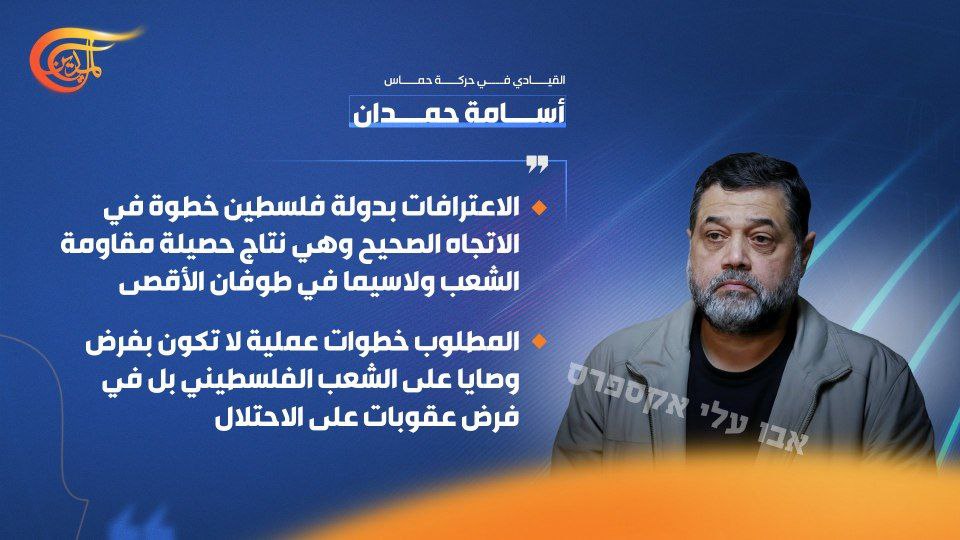 In einem Interview mit dem libanesischen Sender Al Mayadeen nimmt der hochrangige Hamas-Funktionär Osama Hamdan die Anerkennung eines palästinensischen Staates für sich in Anspruch: