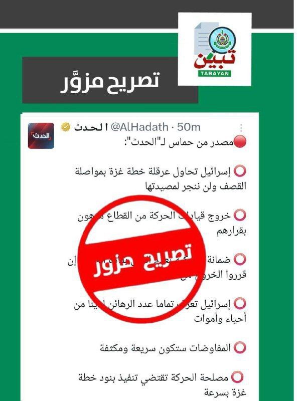 Laut der Erklärung der Bewegung sei der Bericht, den Al-Hadath einer Quelle in der Hamas zuschreibt, wonach die Hamas einer schrittweisen Abrüstung unter internationaler Aufsicht zugestimmt habe, sowie weitere Zitate nicht korrekt. Verlässliche Informationen sollten laut der Bewegung nur über den offiziellen Kanal der Hamas eingeholt werden.