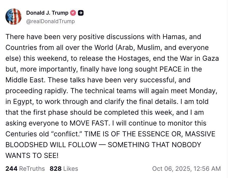 Präsident Trump zeigt sich optimistisch hinsichtlich des Abkommens mit der Hamas: „Mir wurde gesagt, dass die erste Phase diese Woche abgeschlossen werden soll.“