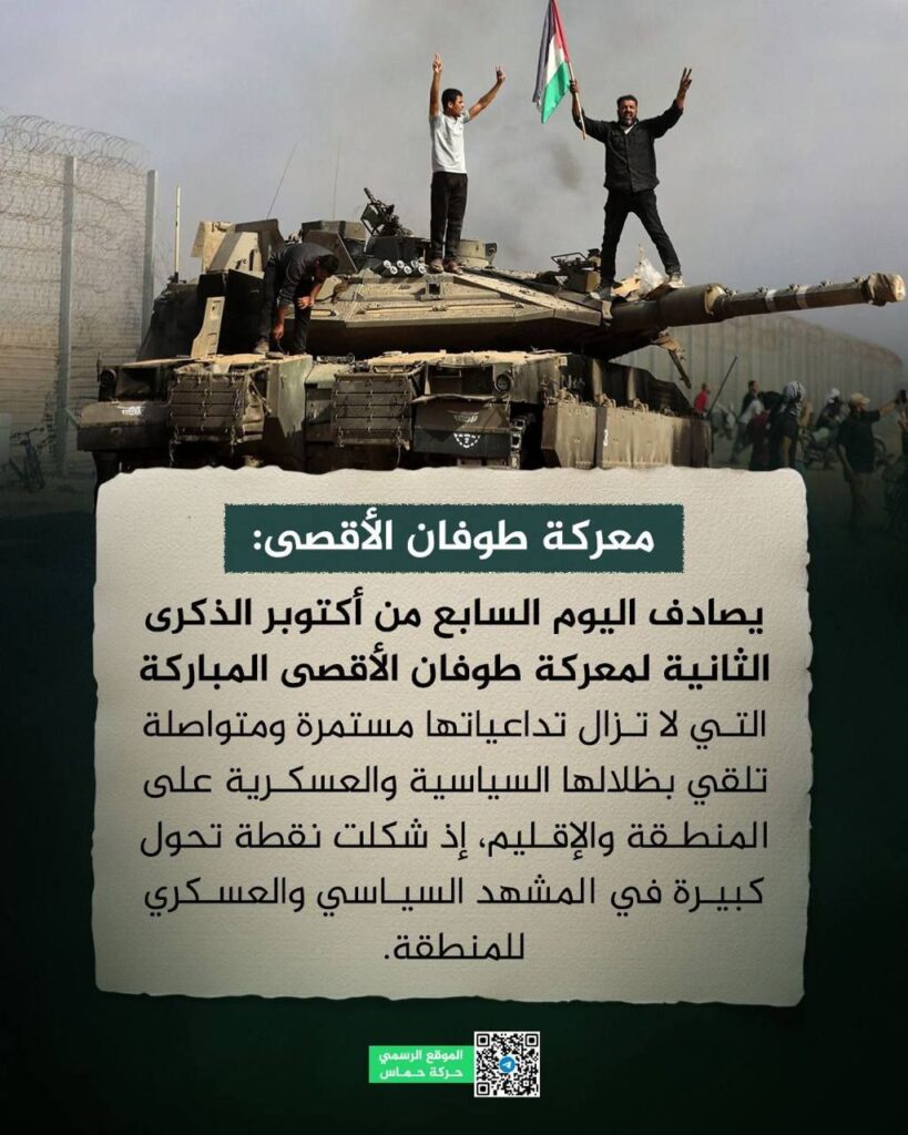 - Heute, am 7. Oktober, wird der zweite Jahrestag der gesegneten Schlacht „Al-Aqsa-Flut“ begangen, deren Folgen weiterhin politischen und militärischen Einfluss auf die Region und das Gebiet ausüben und einen bedeutenden Wendepunkt in der politischen und militärischen Lage der Region darstellen.