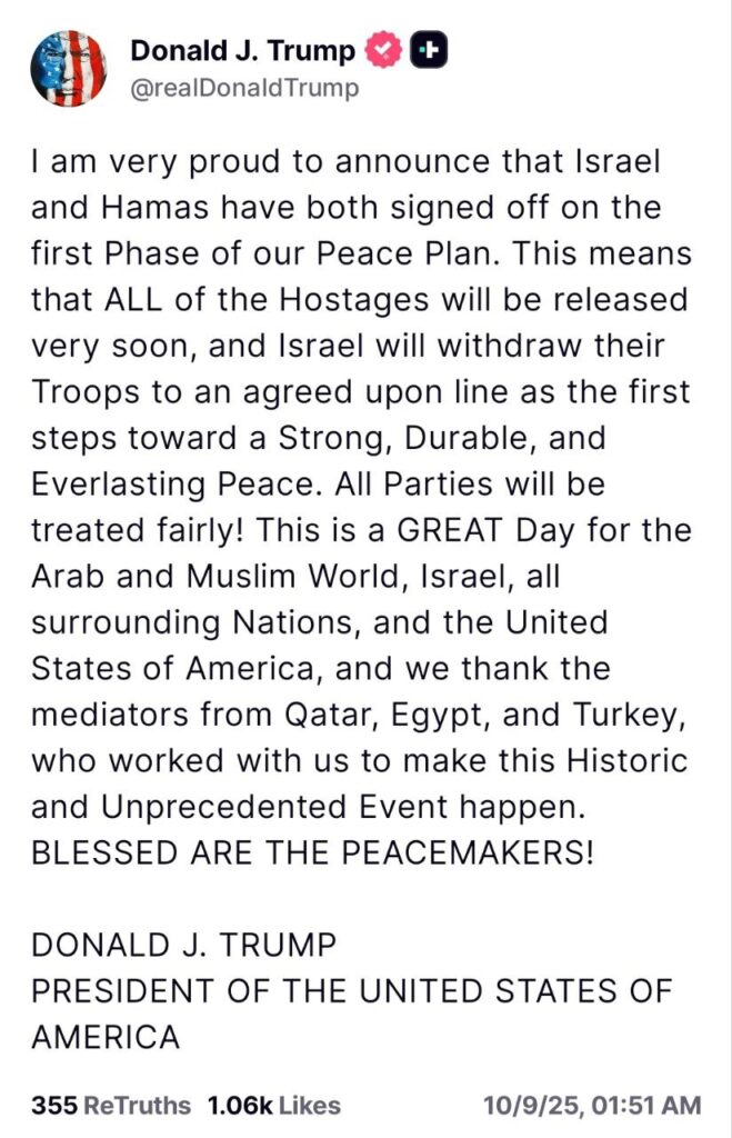 „Israel und die Hamas haben beide die erste Phase unseres Friedensplans unterzeichnet.“