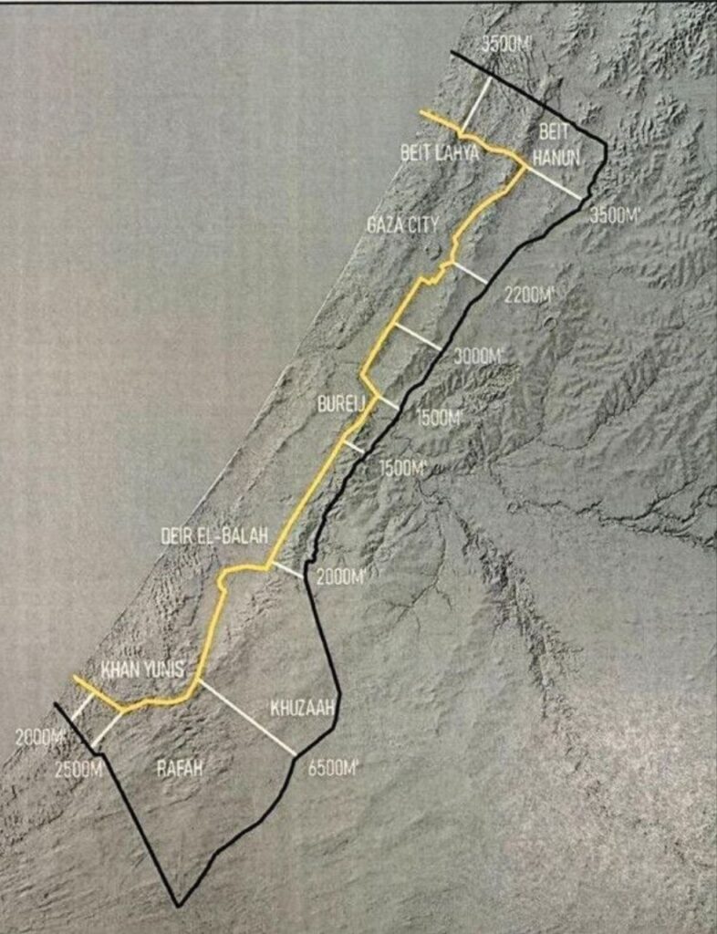 Dies ist die neueste von Präsident Trump vorgelegte Rückzugskarte. Sie zeigt die gelbe Linie – die Linie, bis zu der sich die IDF-Truppen zurückziehen werden (sollen), um die Freilassung der Geiseln im Rahmen der ersten Phase des Abkommens abzuschließen.