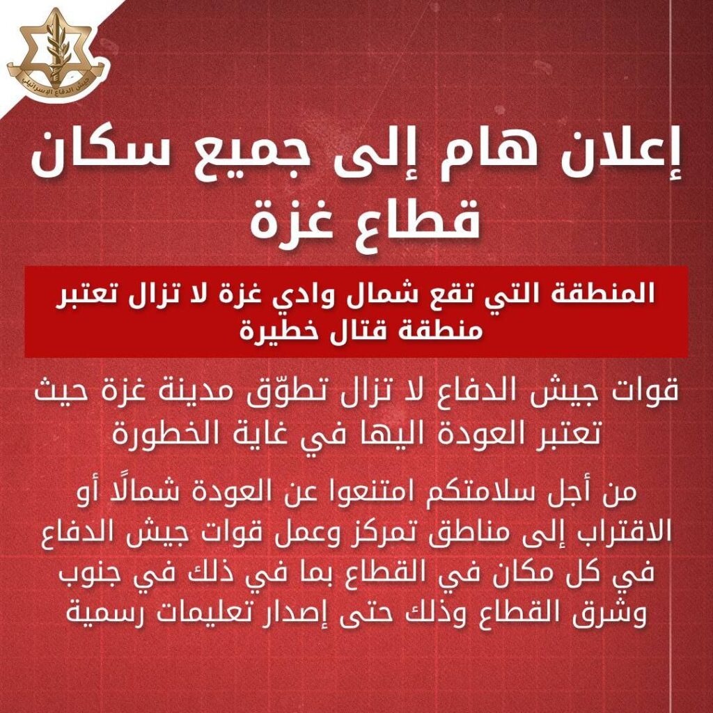 Der arabische Sprecher der IDF veröffentlichte heute Morgen, nach den Erklärungen zur Einigung, eine Mitteilung an die Bewohner des Gazastreifens. Darin hieß es, ein Gebiet in Gaza-Stadt gelte weiterhin als gefährliches Kampfgebiet und die Bewegung nördlich der Wadi-Gaza-Brücke (Gebiet der Netzarim-Achse) sei für Personen aus dem Süden nicht gestattet.