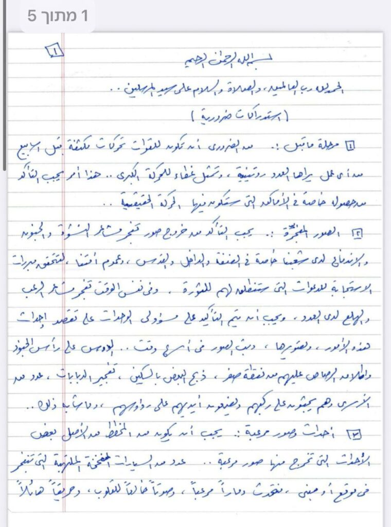 „Es müssen im Voraus Ereignisse geplant werden, aus denen schreckliche Aufnahmen entstehen – mehrere selbstgebaute Sprengsätze in Flammen, die an einem Posten oder in einem Gebäude explodieren und schreckliche Zerstörungen verursachen, herzzerreißende Szenen, furchtbares Feuer. Fünf oder zehn solcher Fotos werden ihnen Todesangst einjagen. Allah wird sie aus einer Richtung angreifen, von der sie es nicht erwarten, und Schrecken in ihre Herzen säen. Es muss auf zwei oder drei Aktionen vorbereitet werden, deren Ziel es ist, ein ganzes Viertel oder einen Kibbuz in Brand zu setzen – Benzin oder Diesel aus einem speziellen Tank auszugießen, den Ort anzuzünden und die Aufnahmen zu verbreiten.“