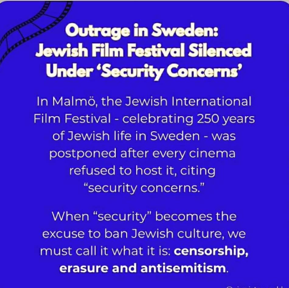 In Malmoe, Schweden, wurde das internationale jüdische Film-Festival, das 250 Jahre jüdischen Lebens in Schweden dokumentieren sollte, nach massiven Drohungen abgesetzt.