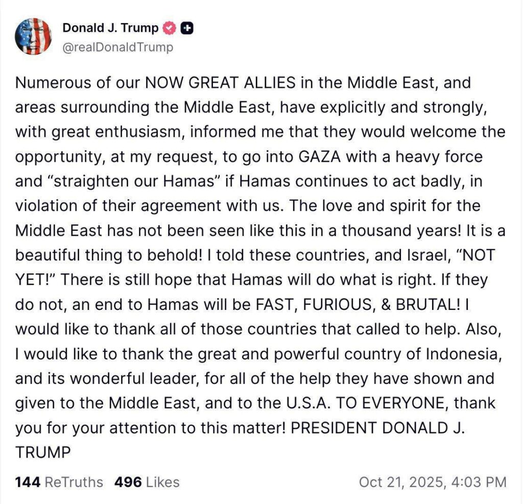 Einige unserer Verbündeten im Nahen Osten und den angrenzenden Regionen haben mir direkt und sehr entschlossen mit großer Begeisterung mitgeteilt, dass sie auf meine Bitte hin gerne die Möglichkeit wahrnehmen würden, mit starker Kraft in Gaza einzumarschieren und die Hamas zur Ordnung zu rufen, falls die Hamas weiterhin schlecht handelt und ihre Vereinbarung mit uns bricht.