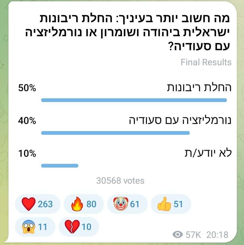 Ergebnisse einer Umfrage auf einem hebräischen Fernsehsender, bei der die Abonnenten gefragt wurden, ob sie die Souveränität über Judäa und Samaria oder die Normalisierung der Beziehungen zu Saudi-Arabien bevorzugen: