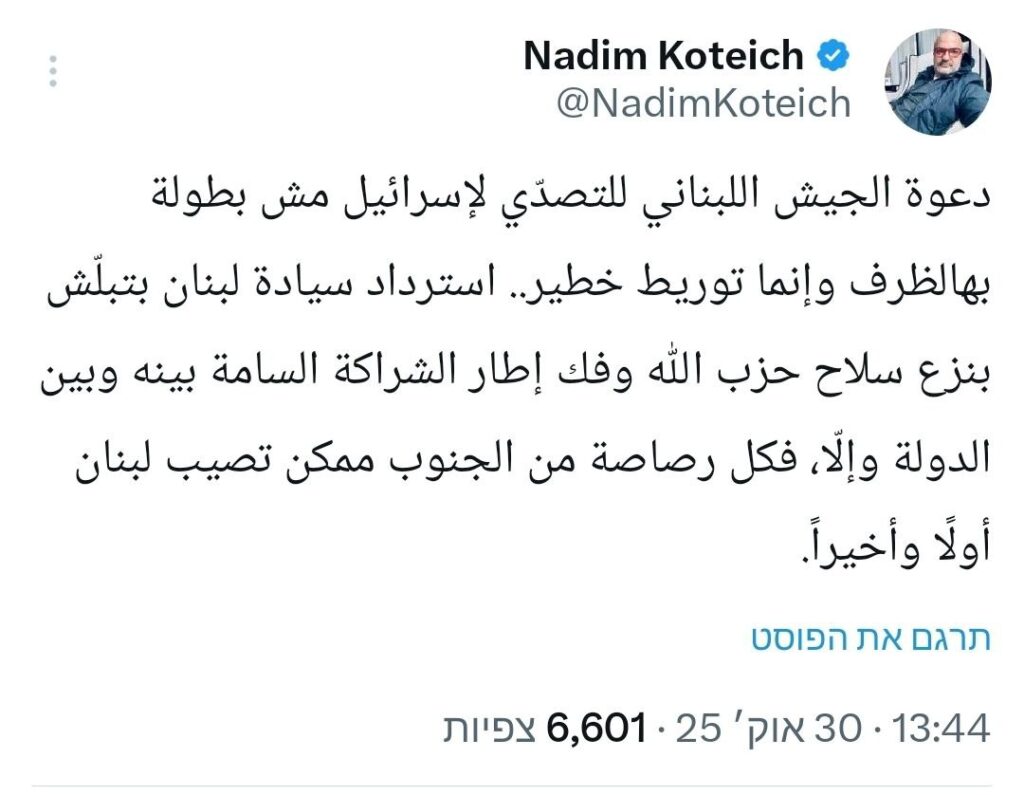Der libanesische schiitische (!) Journalist Nadim Koteich (CEO von Sky News) wendet sich gegen die Anweisung des libanesischen Präsidenten an die libanesische Armee, gegen ein Eindringen von IDF-Truppen in libanesisches Territorium vorzugehen: