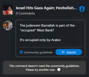 Doch mit dieser Gehirnwäsche (die „West Bank“ existiert seit 1967 nicht mehr und nur die Zone C ist von Israel okkupiert, A und B sind judenreines, von Palästinensern okkupiertes Gebiet) ist noch nicht genug: Mein Kommentar, der das kritisieren wollte, wird Sekunden nachdem ich ihn abgeschickt habe gleich blockiert (s. ScreenShot).