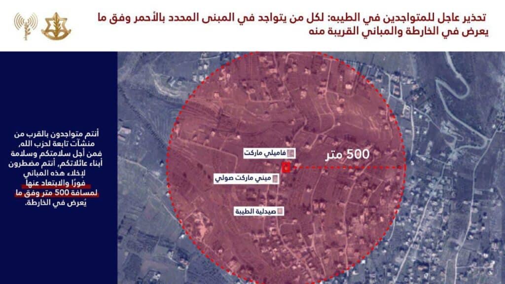 Der arabische Sprecher der israelischen Streitkräfte, Avichay Adraee, warnte die Bewohner von Tayibe und Tir Daba im Südlibanon vor einer sofortigen Evakuierung, da die israelischen Streitkräfte einen Angriff auf die Infrastruktur der Hisbollah in der Region vorbereiten.