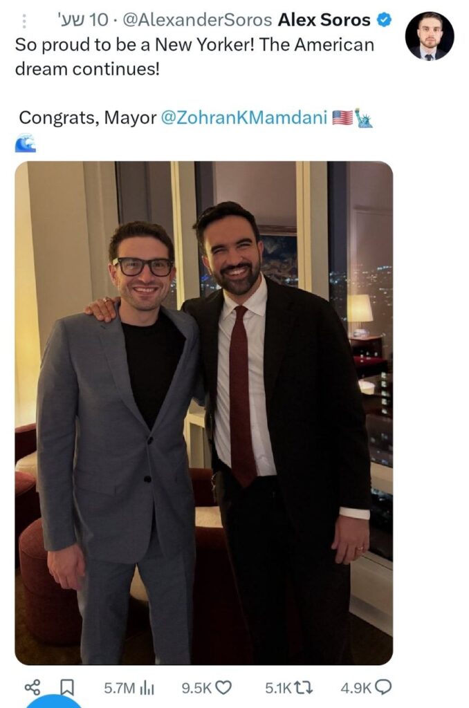 Dieses Foto zeigt Alex Soros, den Sohn des jüdischen Milliardärs George Soros und „Erbe des Soros-Imperiums“. Er twittert ein Foto, das ihn beim Umarmen von Zohran Mamdani zeigt.
