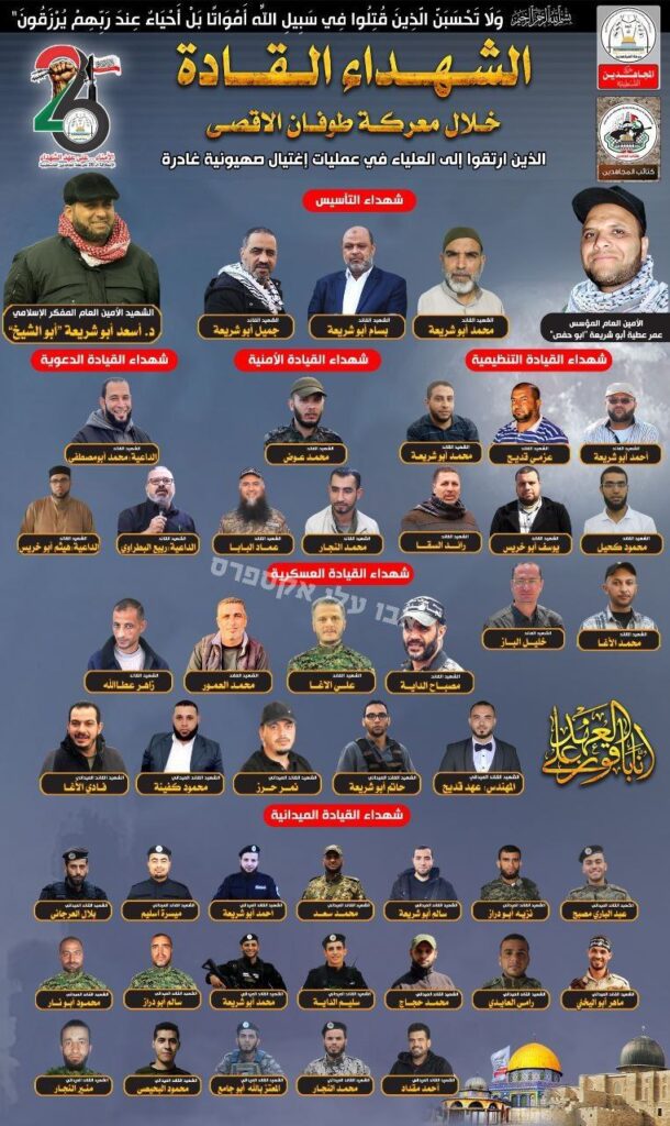 Die Kataib al-Mujahideen, die Terrororganisation, die Mitglieder der Familie Bibas entführt hat, veröffentlichte heute Morgen die Liste der Kommandeure der Organisation auf allen Ebenen, die während des Krieges von den israelischen Streitkräften bei Attentatsoperationen eliminiert wurden, vom Oberkommando und der Gründergeneration der Organisation bis hin zu den Feldkommandeuren.