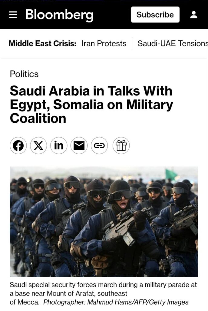 Die amerikanische Nachrichtenagentur Bloomberg berichtet, dass Saudi-Arabien Gespräche mit Ägypten und Somalia über die Bildung eines Militärbündnisses führt.