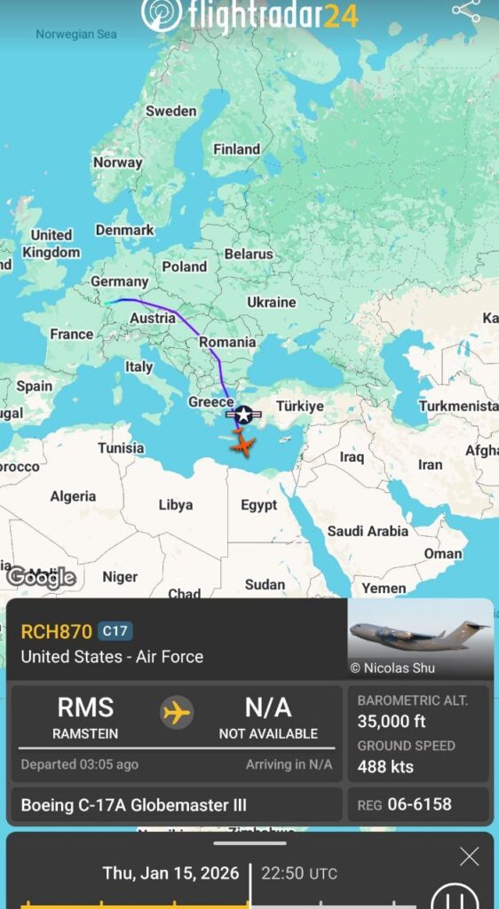 Vier schwere Transportflugzeuge vom Typ C-17A der US-Armee sind auf dem Weg von Westeuropa zum Luftwaffenstützpunkt Diego Garcia.