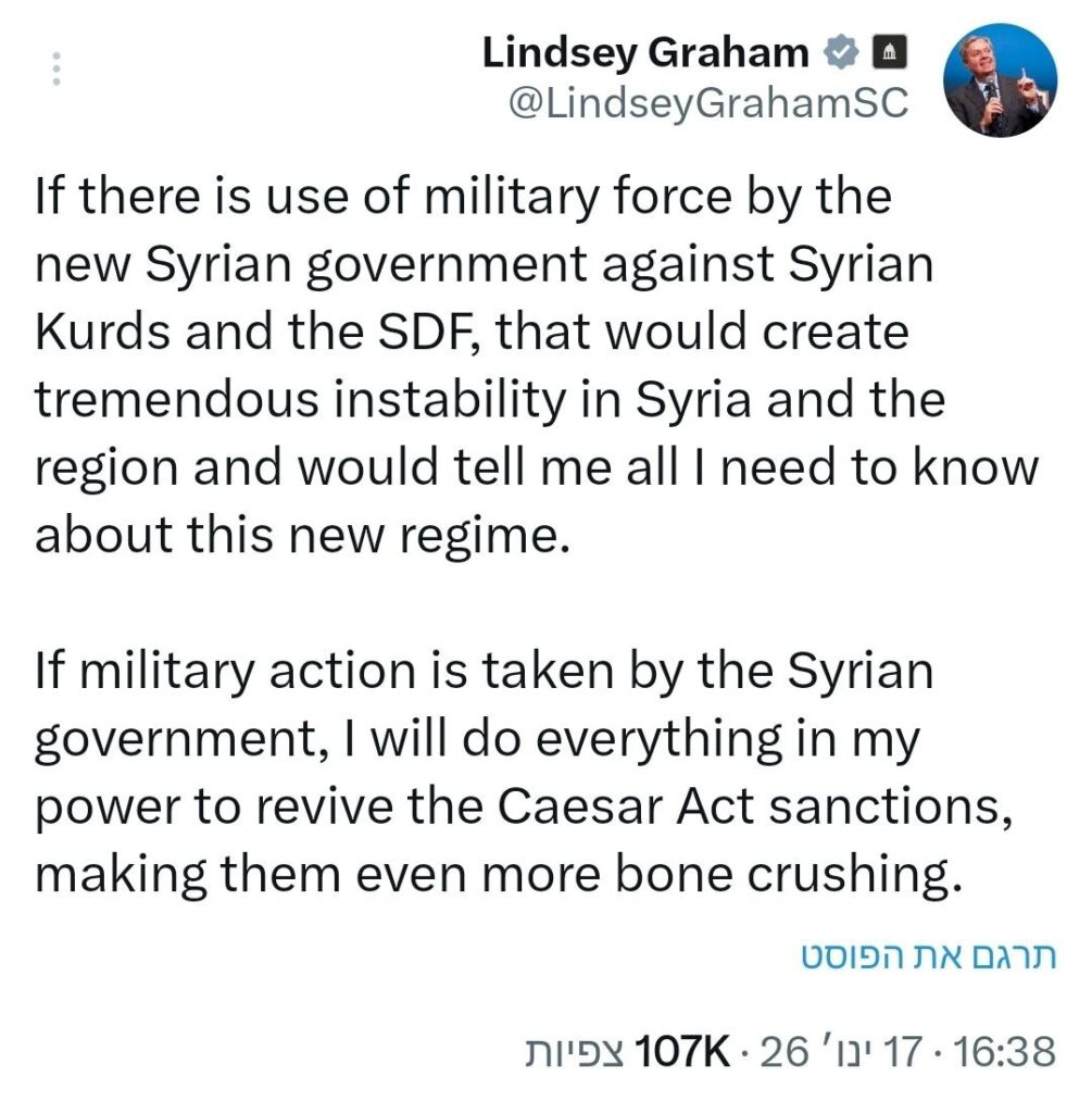 In einem Beitrag auf X äußert Graham seine wachsende Besorgnis über das Vorgehen des syrischen Regimes gemeinsam mit der Türkei gegen, wie er es nennt, die wichtigsten Verbündeten der USA, die Kurden