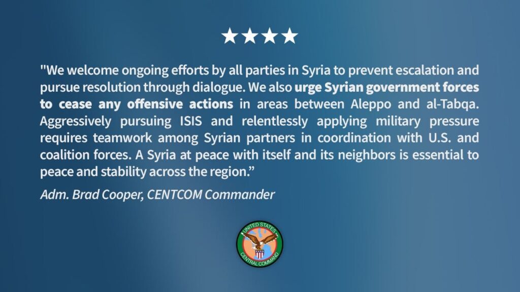 Der Kommandeur des US-Zentralkommandos (CENTCOM), Brad Cooper, fordert die syrische Armee auf, alle Offensivaktionen zwischen Aleppo und Tabqa einzustellen.