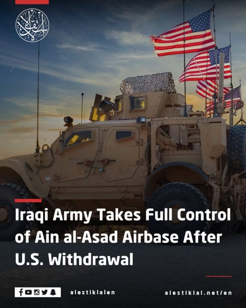 Nach 22 Jahren und inmitten wachsender Spannungen mit dem Iran haben die USA gestern ihren vollständigen Abzug von einem ihrer größten Stützpunkte in der Region abgeschlossen – dem Stützpunkt Ain al-Asad im Irak (nordwestlich von Bagdad).