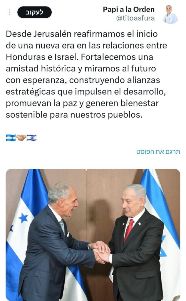 Asfura twitterte heute, dies sei der Beginn einer neuen Ära in den Beziehungen zwischen Honduras und Israel.