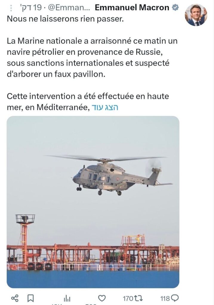 Die französische Marine hat heute Morgen im Mittelmeer mit Unterstützung befreundeter Staaten einen aus Russland kommenden Öltanker beschlagnahmt, der zur russischen Schattenflotte gehört.