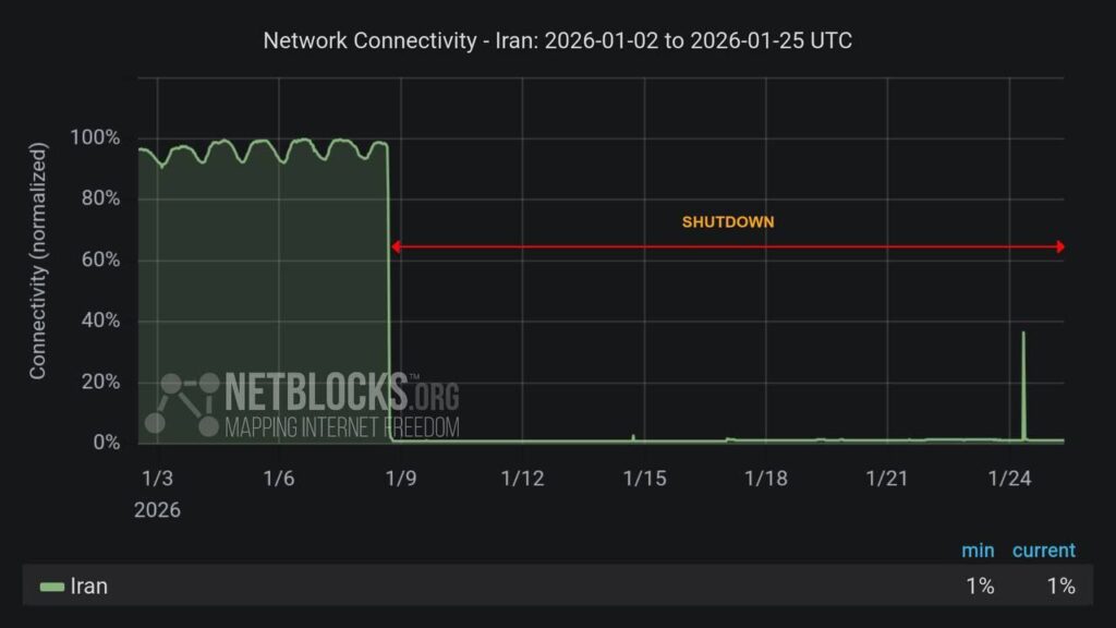 Nach einem kurzzeitigen Anstieg des Internetverkehrs um 40% vor etwa einem Tag ist das Internet im Iran wieder unterbrochen, dies jetzt seit mehr als 400 Stunden.