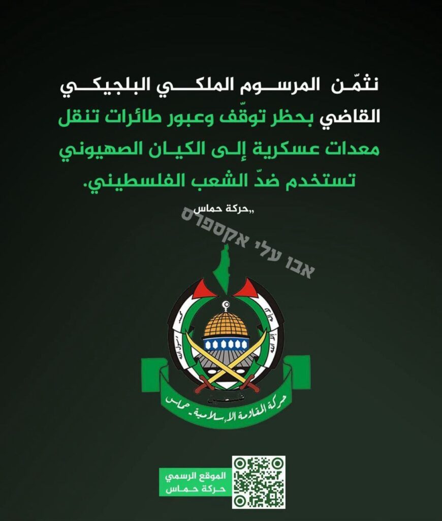 Wir begrüßen den belgischen Königsbeschluss, der den Überflug von Flugzeugen mit Ausrüstung für Israel durch den belgischen Luftraum verbietet.