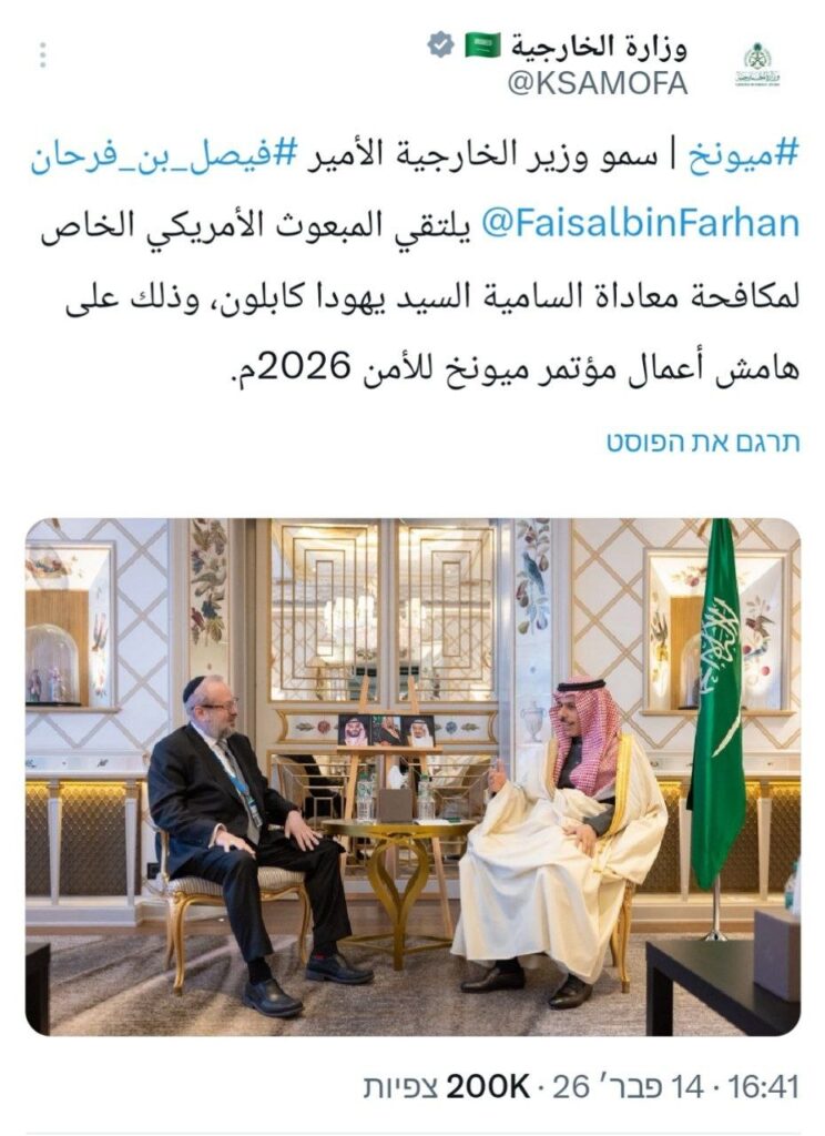 Der saudische Außenminister traf sich gestern am Rande der Münchner Sicherheitskonferenz mit Rabbi Yehuda Kaplun, dem Sondergesandten der Trump-Regierung zur Bekämpfung von Antisemitismus.