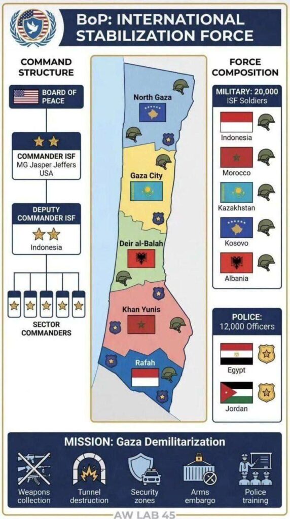 Karte der Stationierung zukünftiger internationaler „Stabilisierungskräfte“ im Gazastreifen