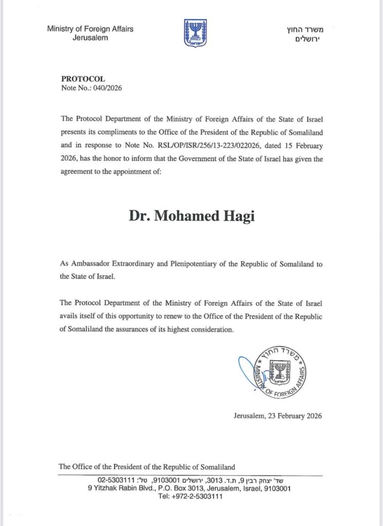 Israel hat seinen ersten offiziellen Botschafter aus der Republik Somaliland empfangen.