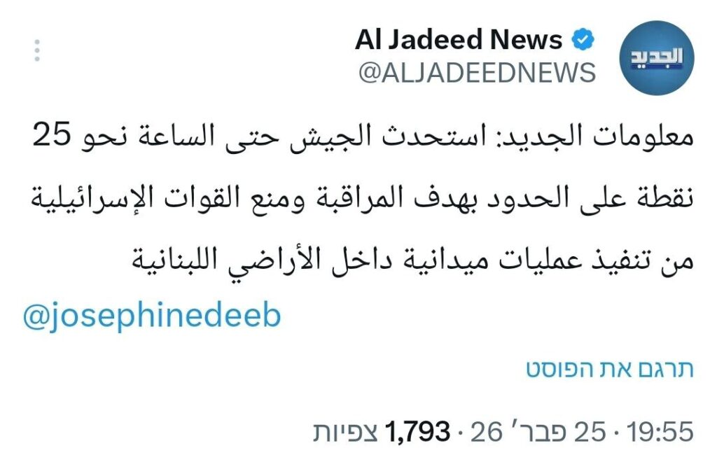 Die libanesische Zeitung Al Jadeed berichtet, dass die libanesische Armee etwa 25 neue Punkte eingerichtet hat, um die israelischen Streitkräfte zu beobachten und israelische Bodenoperationen auf libanesischem Gebiet zu verhindern.