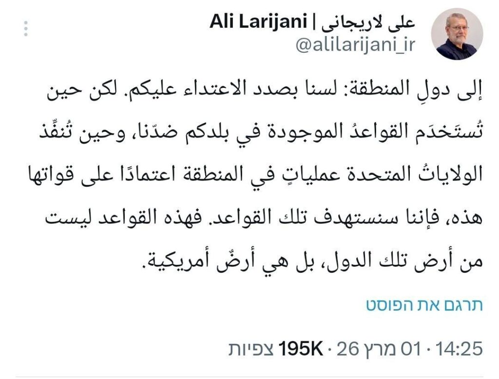 Kommentar – Herr Larijani, umfassen die amerikanischen Stützpunkte auch internationale Flughäfen und Luxushotels in Dubai und zivile Wohntürme in Bahrain?