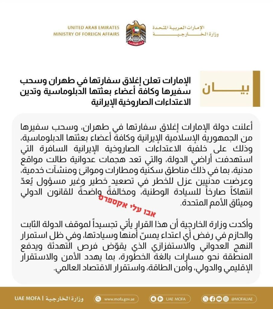 Das Außenministerium der Vereinigten Arabischen Emirate gibt die Schließung seiner Botschaft im Iran und die Rückkehr des gesamten diplomatischen Personals in die VAE bekannt, nachdem der Iran Angriffe auf das Land, darunter zivile Ziele, Wohngebiete, Häfen und mehr, verübt hat.
