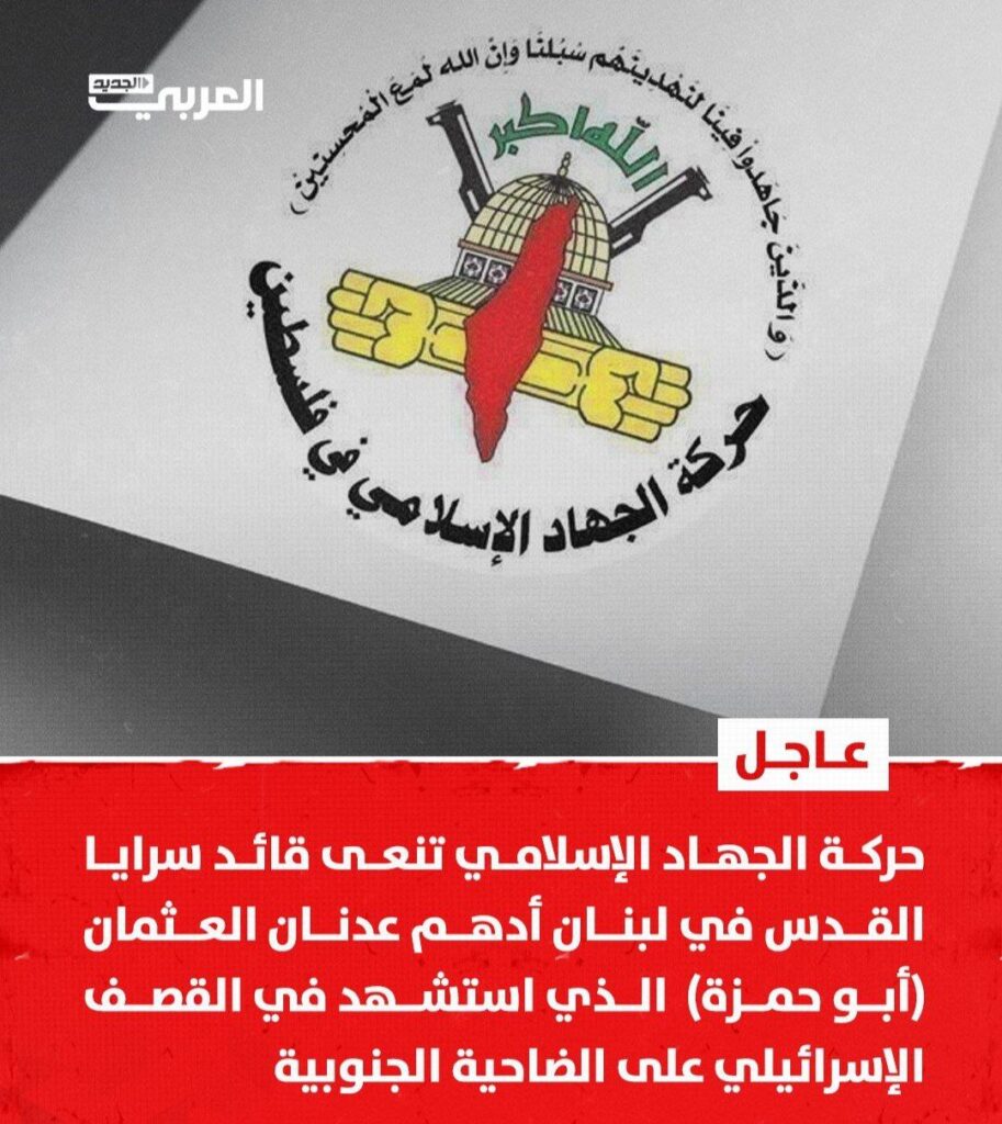 Der militärische Flügel des Islamischen Dschihad verkündet, dass der Kommandeur des Flügels im Libanon, Adham Al-Atman (Abu Hamza), heute Morgen bei einem israelischen Angriff in Dahieh, Beirut, getötet wurde.