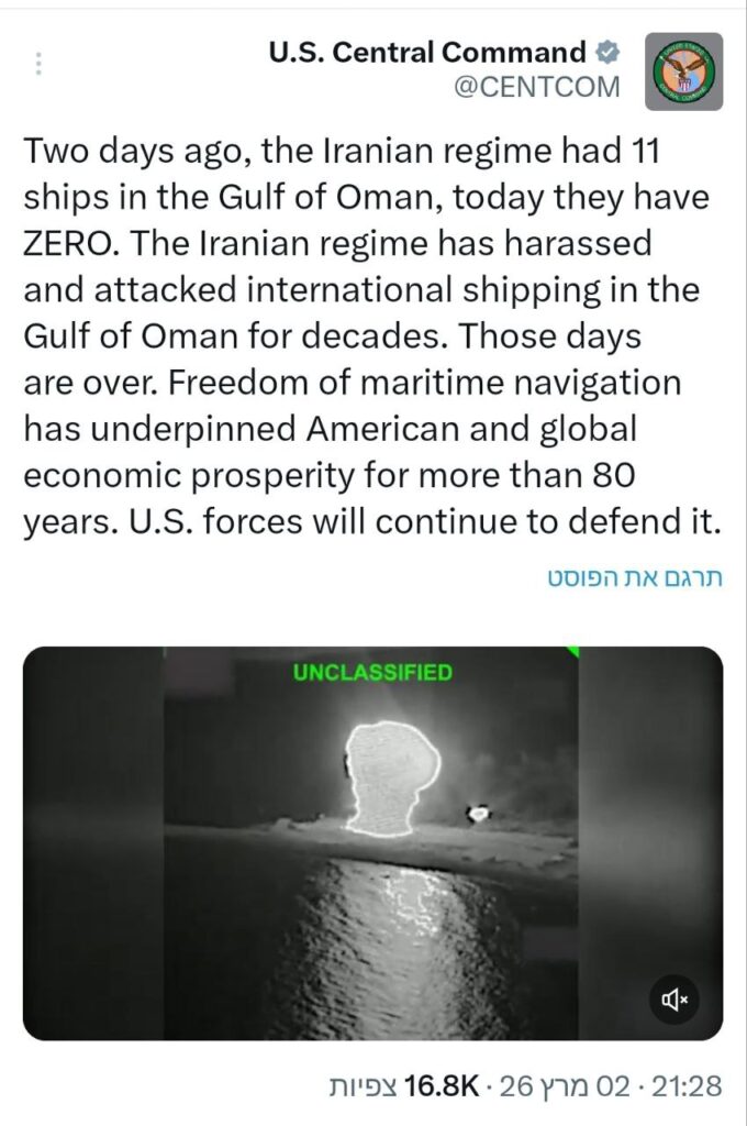 „Vor zwei Tagen operierten noch 11 Schiffe des iranischen Regimes im Golf von Oman, heute ist keines mehr da.