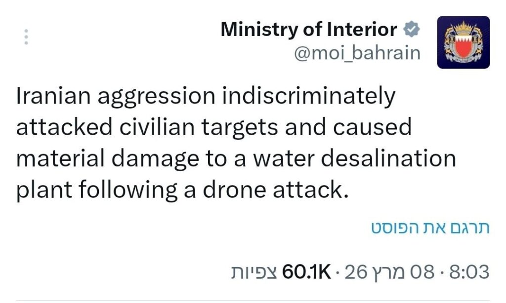 Der Iran hat letzte Nacht eine Trinkwasserentsalzungsanlage in Bahrain angegriffen – dies wurde offiziell vom bahrainischen Innenminister bestätigt.
