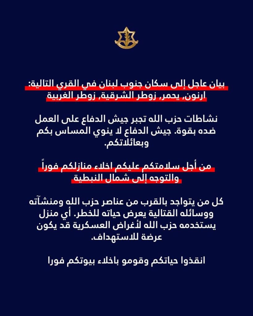 Der Sprecher der israelischen Streitkräfte (IDF) ordnete heute Morgen die Evakuierung von vier Dörfern nördlich des Litani an: Yuhmor, Arnoun, Ost-Zotar und West-Zotar.