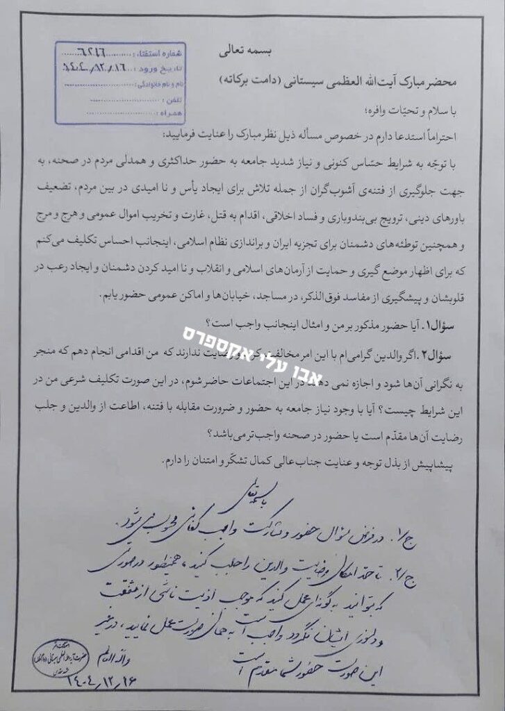Ayatollah Ali Sistani, die höchste religiöse Autorität der schiitischen Welt (wohnhaft im Irak), leistet religiöse Unterstützung für das iranische Regime und verkündet, dass es für alle Schiiten eine „kollektive religiöse Pflicht“ sei, an Demonstrationen im Iran zur Unterstützung des Regimes teilzunehmen.