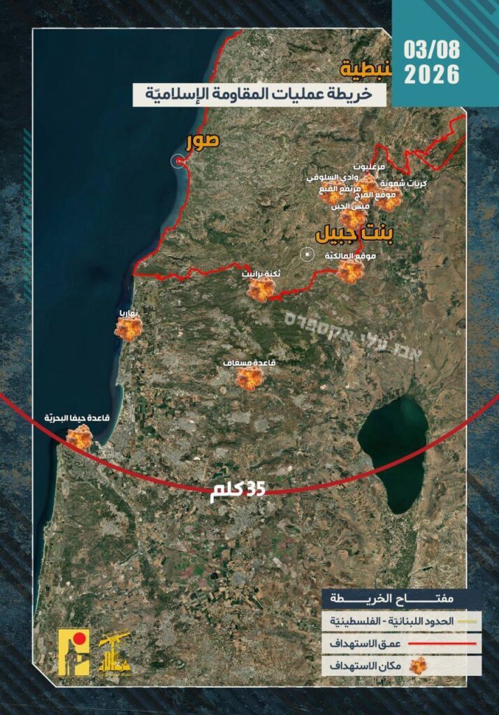 Die Hisbollah veröffentlichte gestern Abend die Karte der Einsätze, die sie in den vergangenen 24 Stunden gegen Israel durchgeführt hat (insgesamt 18, nach ihren Angaben) – der südlichste Einsatz richtete sich gegen den Marinestützpunkt Haifa.
