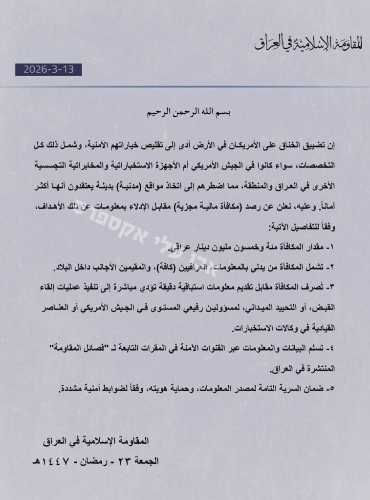 Schiitische Milizen im Irak haben eine Belohnung von 150 Millionen irakischen Dinar (etwa 115’000 USD) für jeden irakischen Einwohner ausgesetzt, der Informationen liefert, die zur Gefangennahme oder Tötung hochrangiger US-amerikanischer Offiziere oder Angehöriger amerikanischer Geheimdienste im Irak führen.