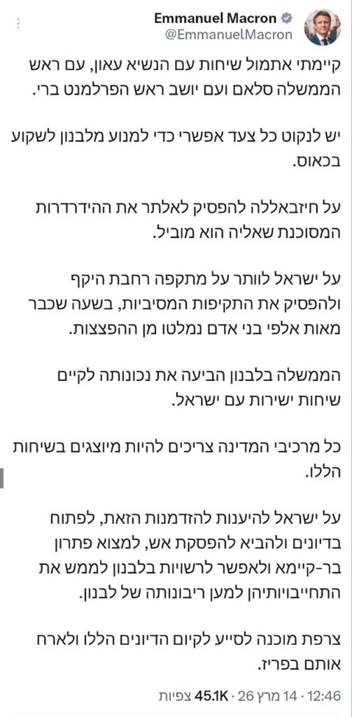 Der französische Präsident Macron twittert auf Hebräisch und fordert Israel auf, die Angriffe im Libanon einzustellen und Verhandlungen mit der libanesischen Regierung aufzunehmen, um einen Waffenstillstand zu erreichen.