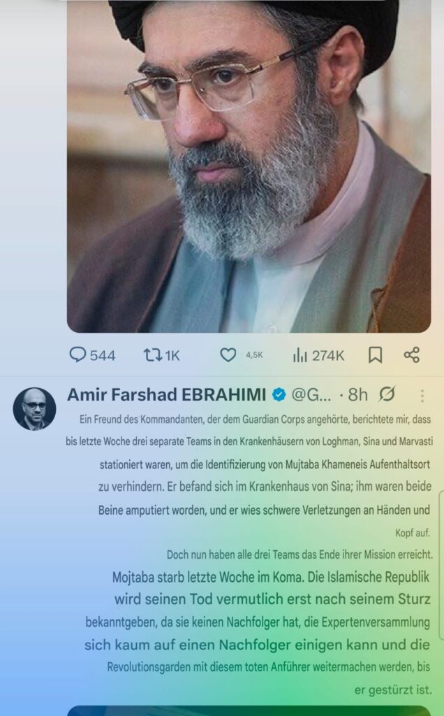 Es wird viel darüber spekuliert, ob der neue Führer im Iran, Mojtaba Khamenei, noch am Leben sei oder nicht und es kursieren darüber viele Meldungen im Netz.
