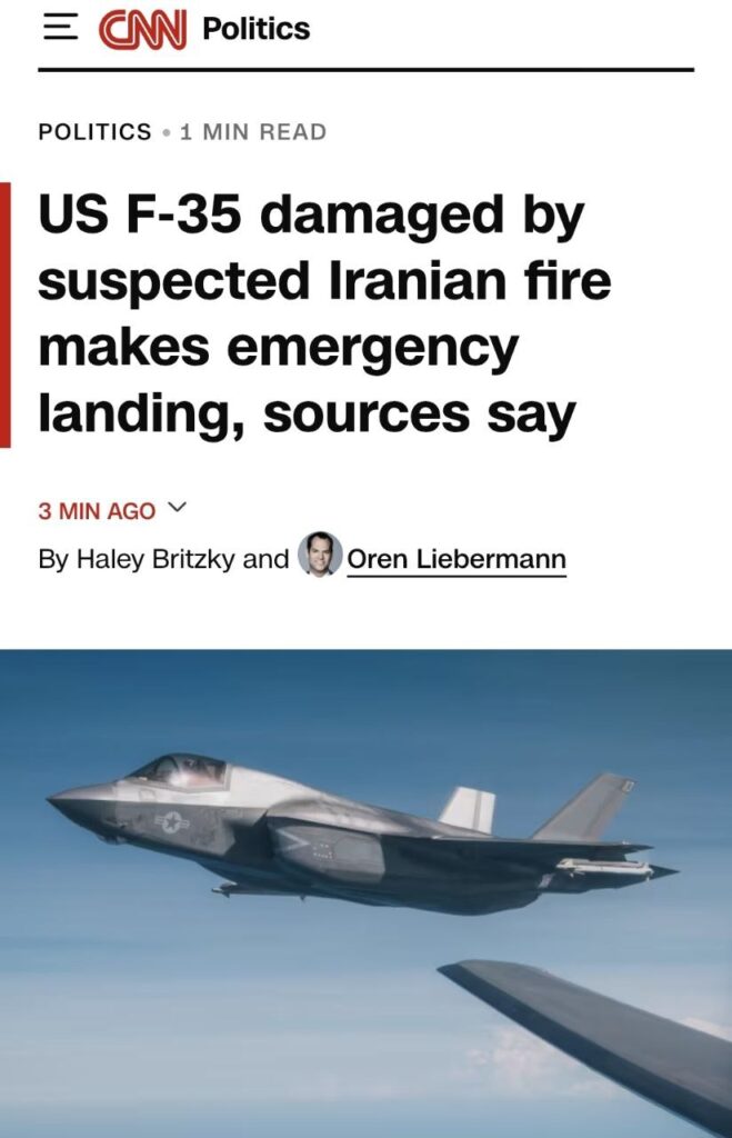 Ein amerikanisches F-35-Kampfflugzeug wurde im iranischen Luftraum beschädigt – möglicherweise durch iranisches Feuer. Das Flugzeug landete notgelandet auf einem Stützpunkt im Nahen Osten. Der Pilot ist unverletzt.