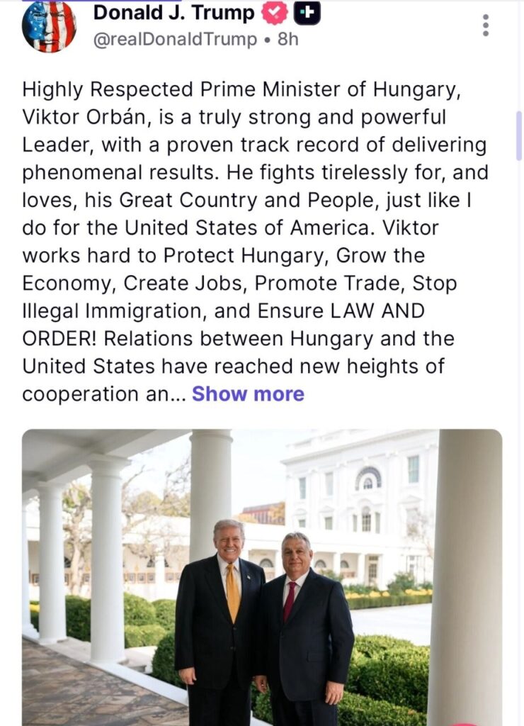 Im Vorfeld der für den 12. April erwarteten Wahlen in Ungarn hat Präsident Trump seine volle Unterstützung für den amtierenden ungarischen Ministerpräsidenten Viktor Orbán bekanntgegeben.