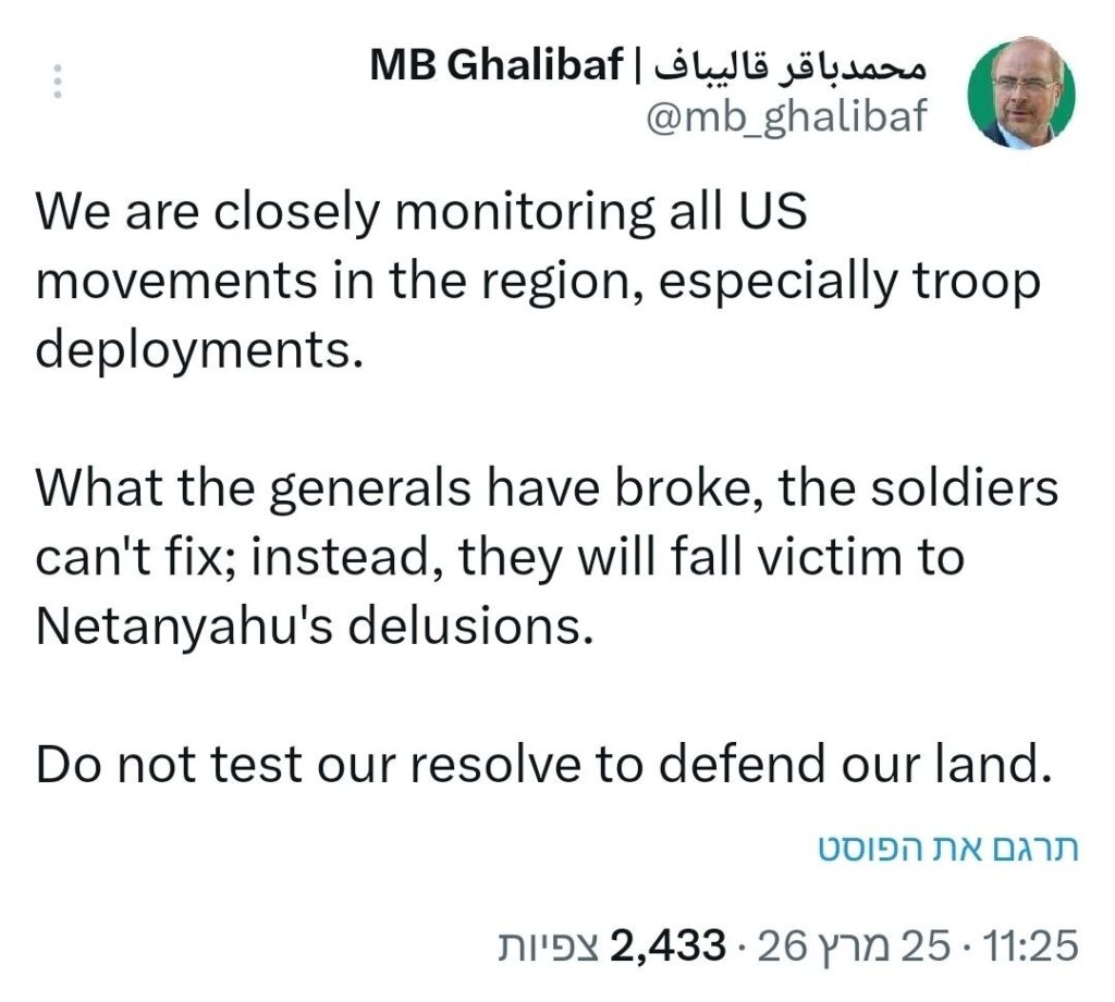 Mohammad Ghalibaf, Sprecher des iranischen Parlaments und laut Trump Gesprächspartner bei den gegenwärtigen „Verhandlungen“, warnt: