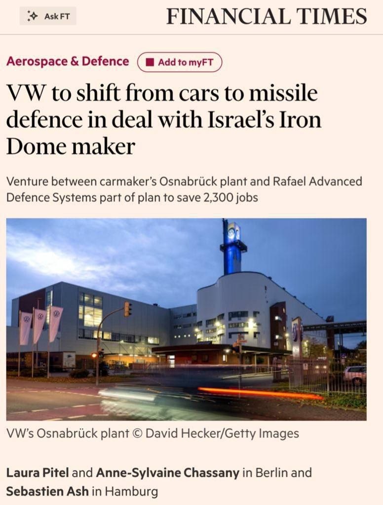 Volkswagen verhandelt mit Rafael über die Umstellung seines Werks in Osnabrück von der Automobilproduktion auf die Fertigung von Komponenten für das Raketenabwehrsystem Iron Dome.