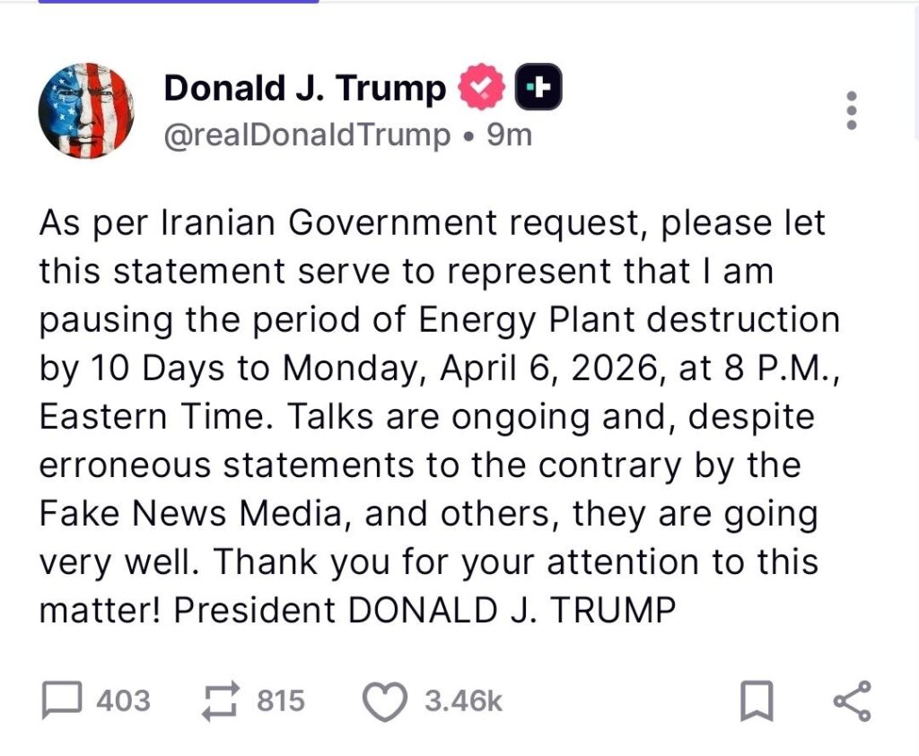 Präsident Trump verlängert das Ultimatum für einen Angriff auf iranische Energieanlagen um 10 Tage bis zum 6. April.